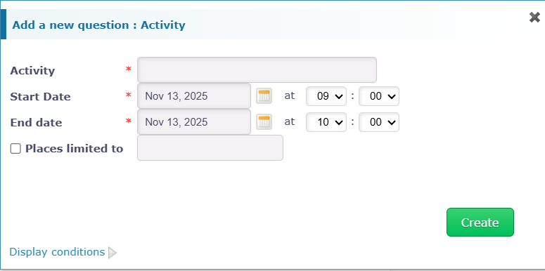 Define the title of the question (its header message), then create a new activity or select one from the existing list: