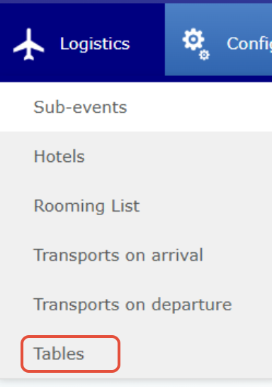 In “Logistics,” ‘Tables’: Select the sub-event (example., “Dinner”) for which you want to create tables: